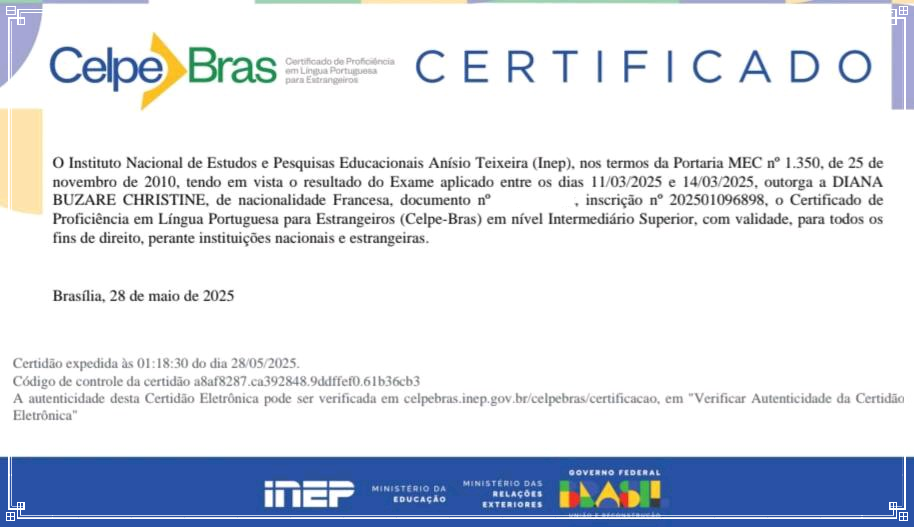 Pour me sentir légitime dans ma démarche, j'ai obtenu en 2025 la certification CELPE BRAS, le seul diplôme de portugais brésilien reconnu internationalement, ce qui atteste de la maîtrise de la langue et ma capacité à l'enseigner.